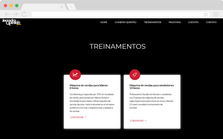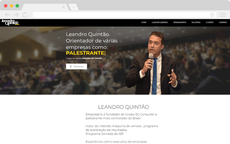 Leandro Quintão é empresário, fundador do Grupo 5G Consultoria e o palestrante mais contratado do Brasil. Atua como consultor de várias empresas no Brasil, com diversos projetos entre eles o Programa de Aceleração 4.0 que visa um olhar gerencial para a corporação visando vendas e lucratividade, juntamente com o alinhamento de todas as áreas de negócios e o relacionamento com os clientes. Além disso, é autor do método Máquina de Vendas, um programa que busca grandes mudanças e um aumento expressivo nas vendas de sua empresa por meio de resultados.